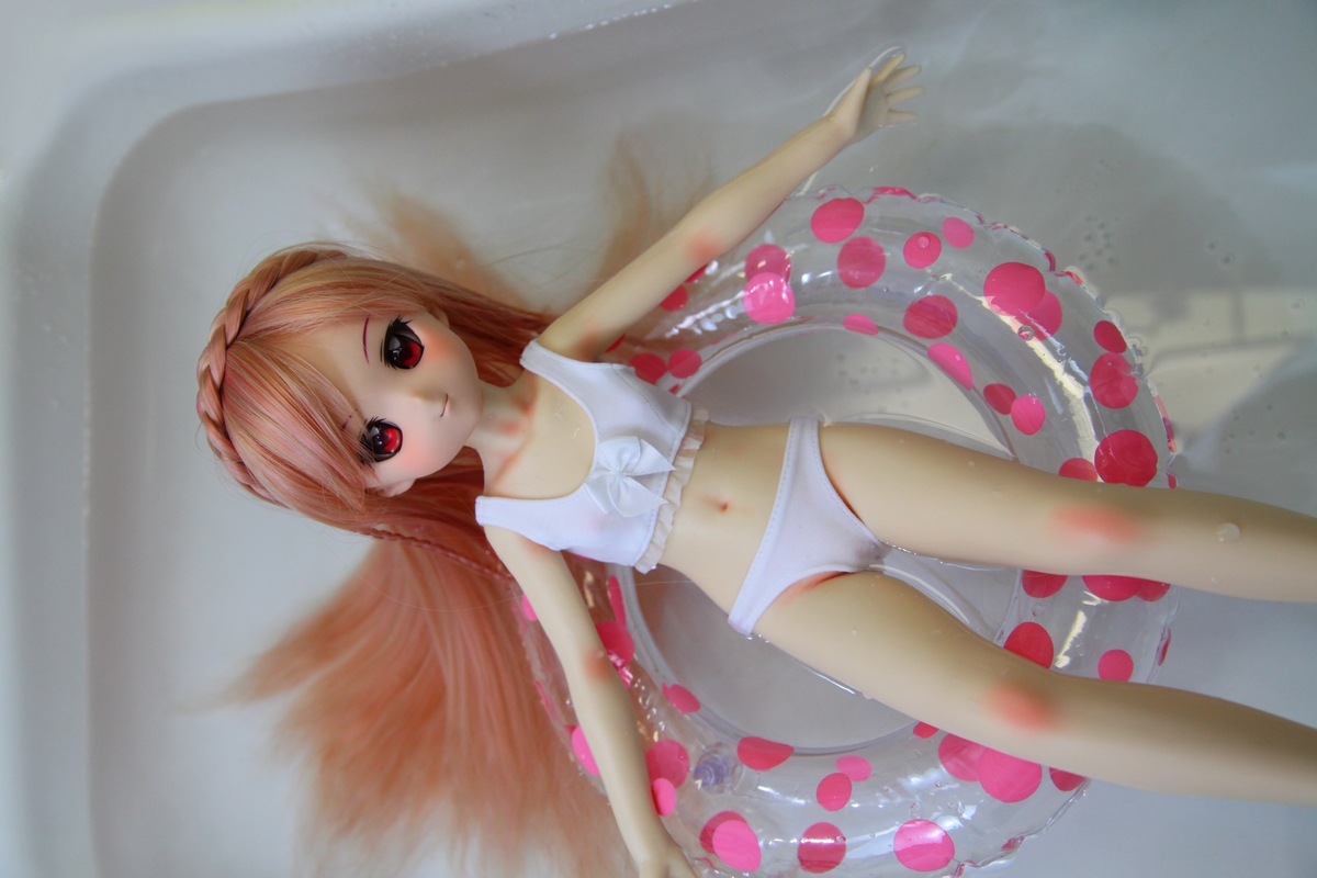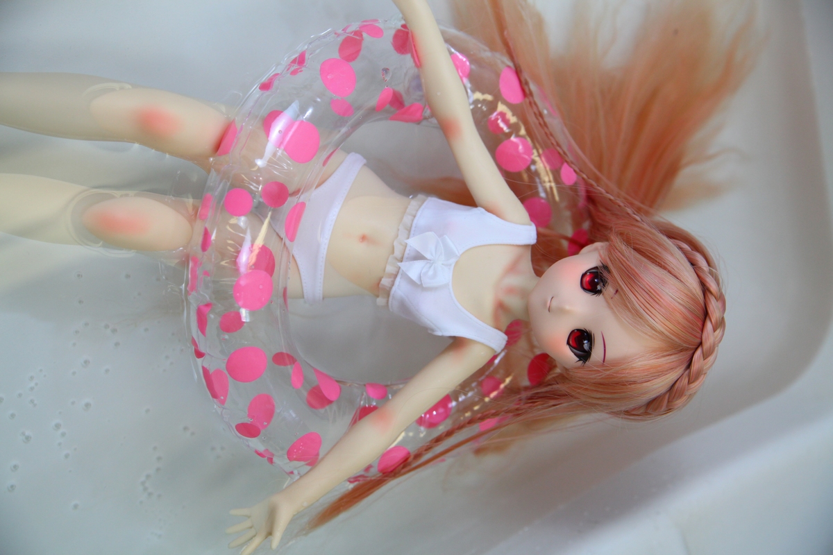 お風呂場ではなく浅い洗面台で浮かべたので足も浮き輪に乗せて足付きしないようにしたんですが、実はアルテボディは水に浮くようで、足を浮き輪の中に入れても足付きしませんでした・・・逆に深いお風呂場とかで立ち泳ぎ風にしようとしても出来ないみたいです